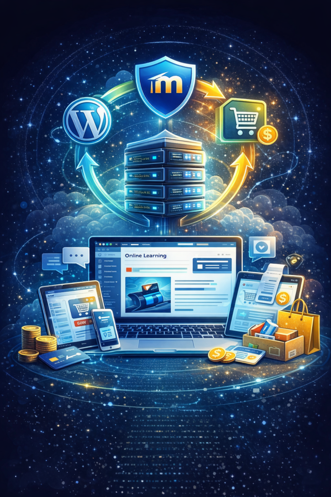 Convierte tu web en un ecosistema educativo: Moodle para aprender, WordPress para comunicar y WooCommerce para vender. Automatiza inscripciones, pagos, suscripciones y accesos en un solo flujo.