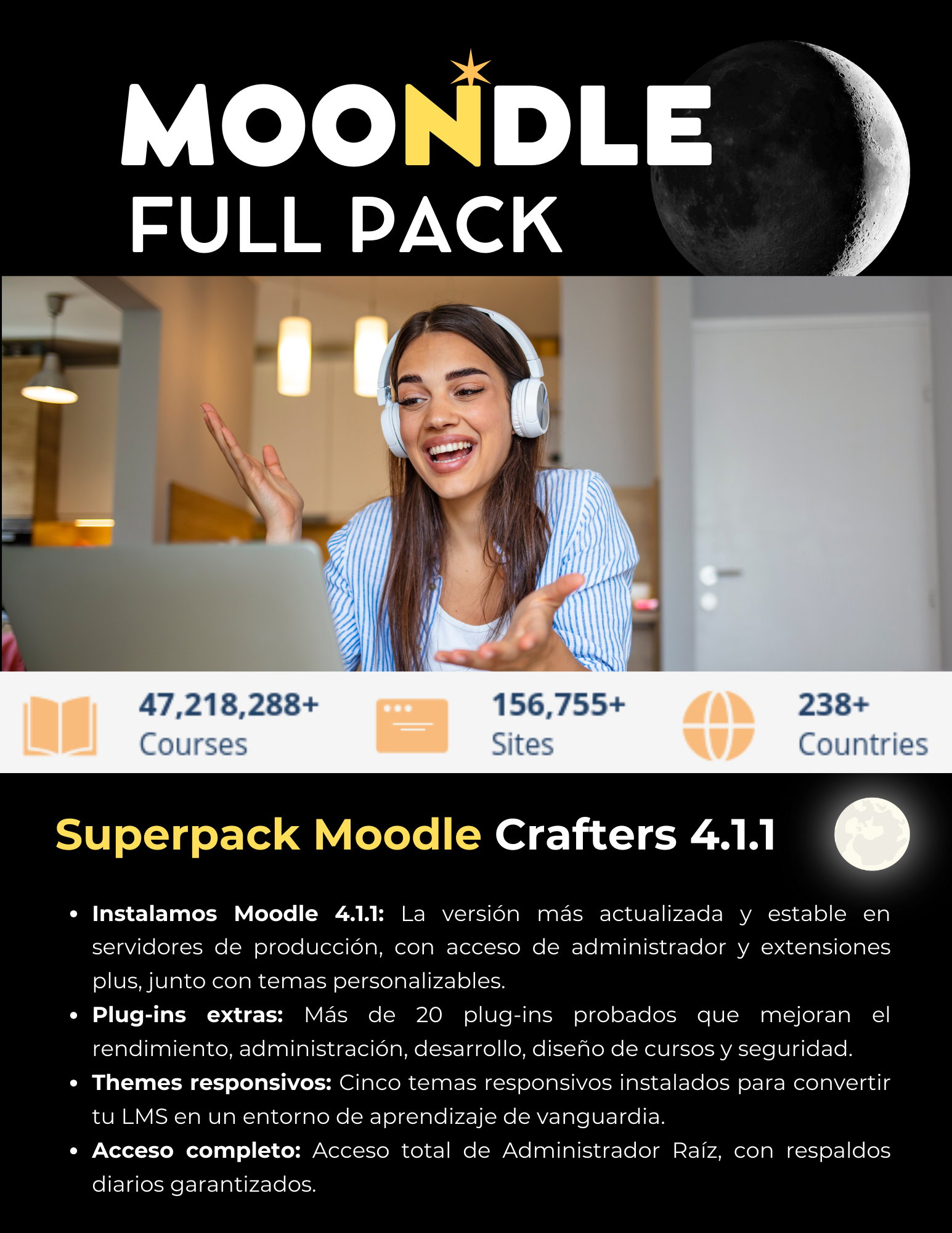 Obtén la plataforma Moodle 4.1.1 robusta, veloz y segura, lista para adaptarse al crecimiento de tu institución. Con nuestras especificaciones avanzadas, tu LMS funcionará sin interrupciones, manejando gran cantidad de usuarios y contenido multimedia con facilidad. Aquí te damos un vistazo de lo que incluimos en tu LMS Moodle Full Pro: